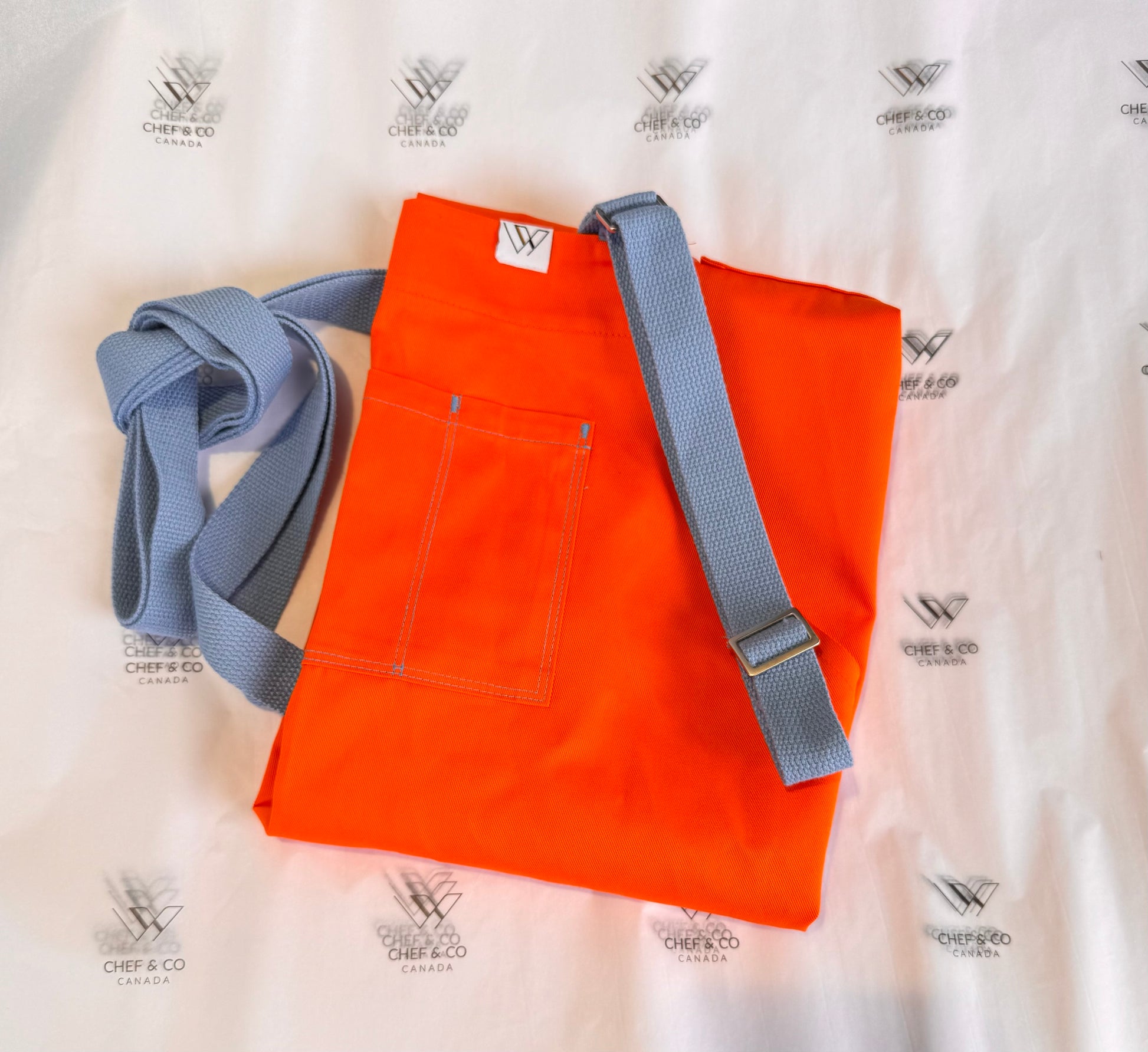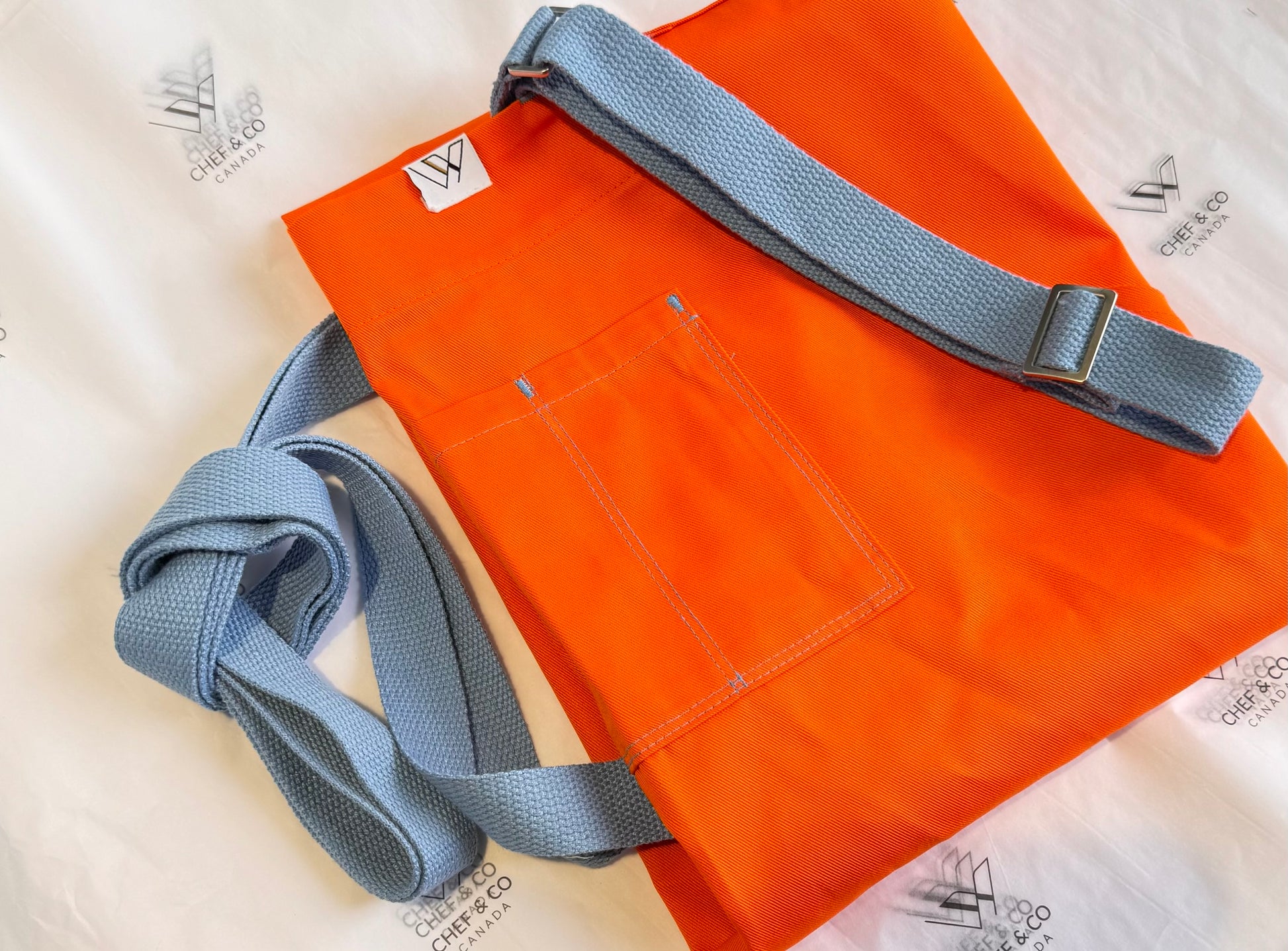 This series features a cotton poly fabric in orange with light blue straps. The detail is in the double stitched pockets matching the straps. There are 3 top pockets and 2 side pockets.