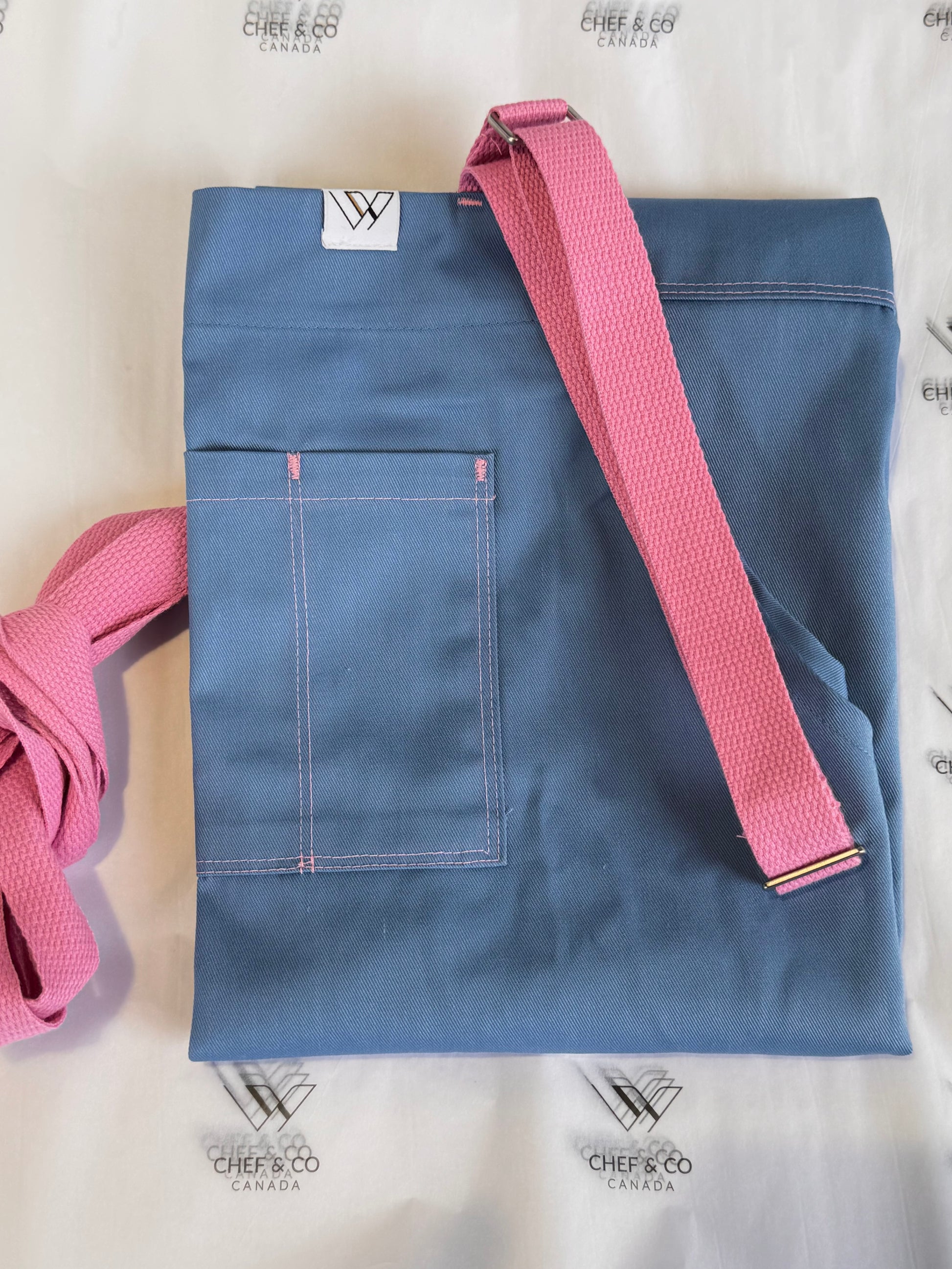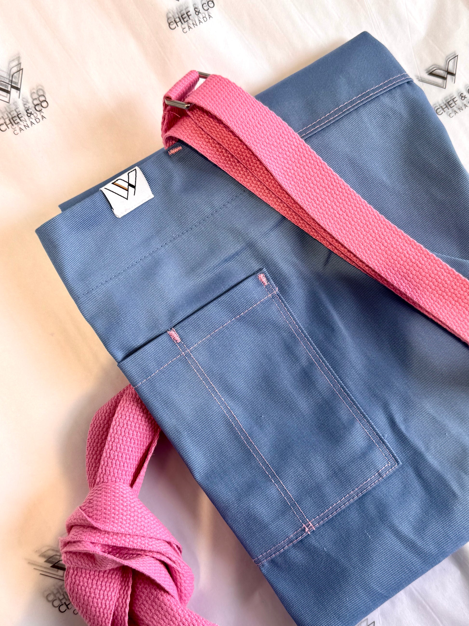 This series features a cotton poly fabric in blue with pink straps. The detail is in the double stitched pockets matching the straps. There are 3 top pockets and 2 side pockets.