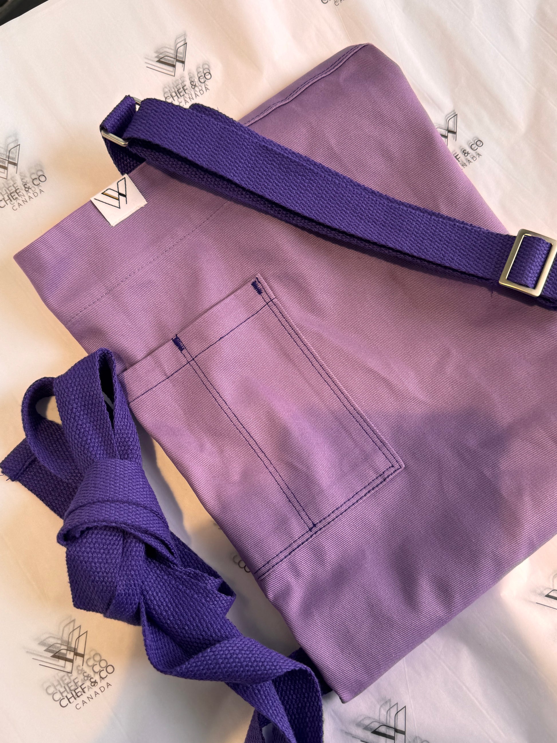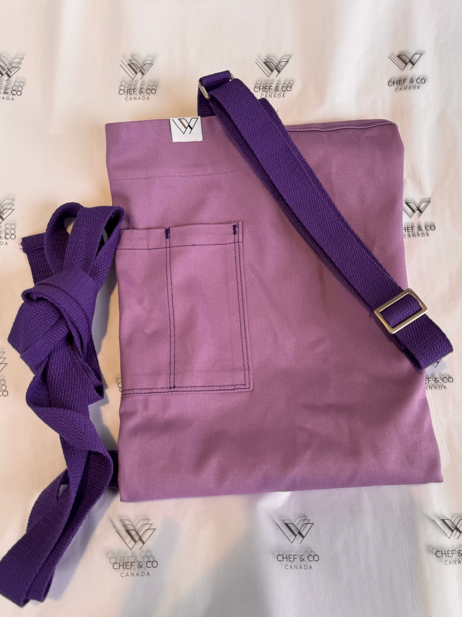 This series features a cotton poly fabric in lavender with purple straps. The detail is in the double stitched pockets matching the straps. There are 3 top pockets and 2 side pockets.