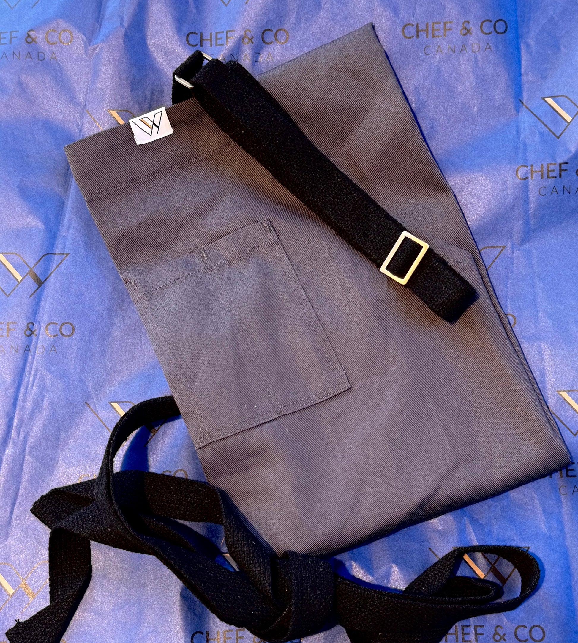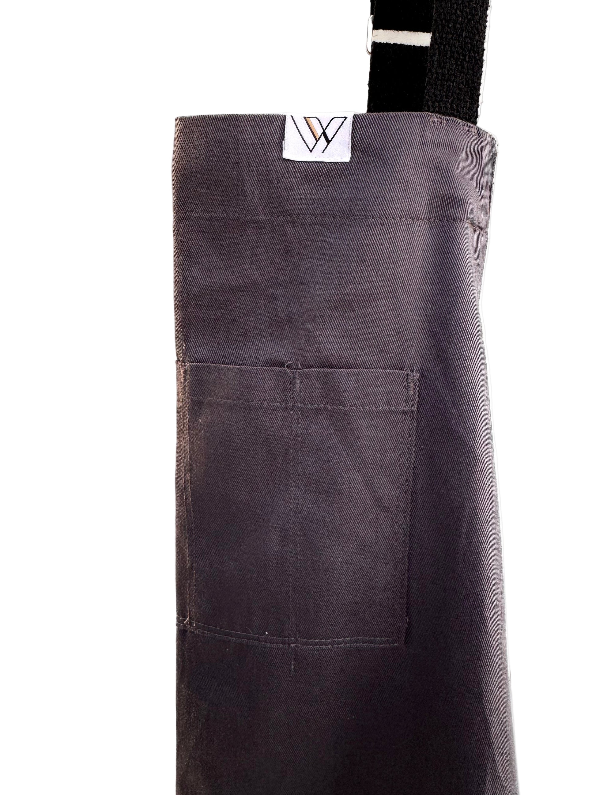 This series has 3 top pockets flushed left. Crafted in gray cotton polyester with black straps. Sizing 5’8”-6’2”