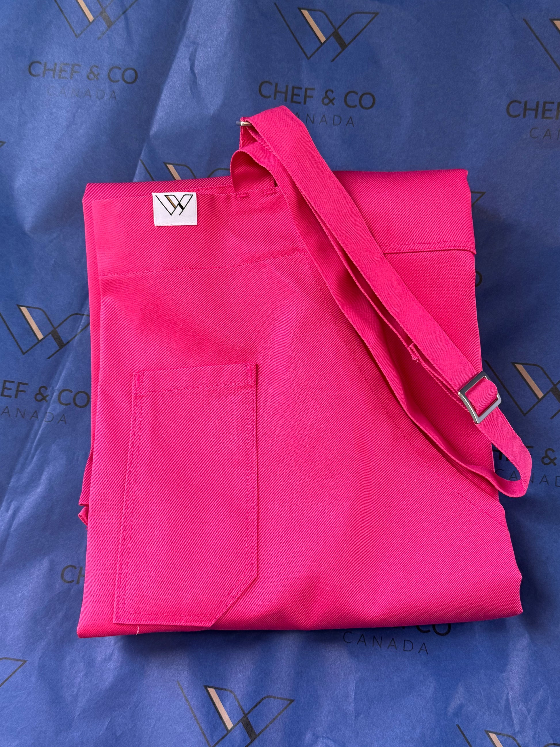Designed in full hot pink with minimal top pocket just enough for essentials along with 2 side pockets in cotton polyester. Sizing 5’2”-5’9” Maroon shows the same pocket style. This apron is hot pink.