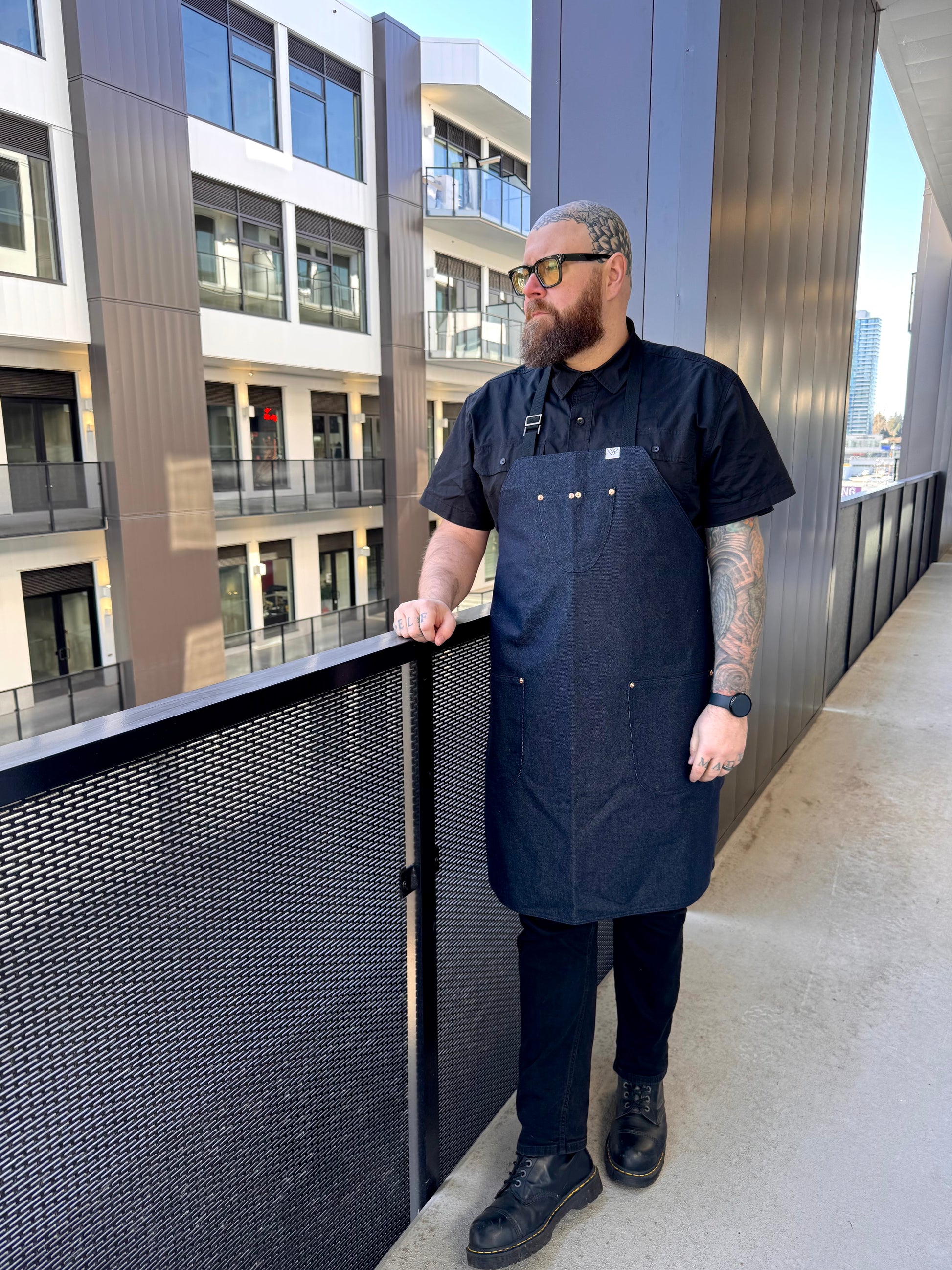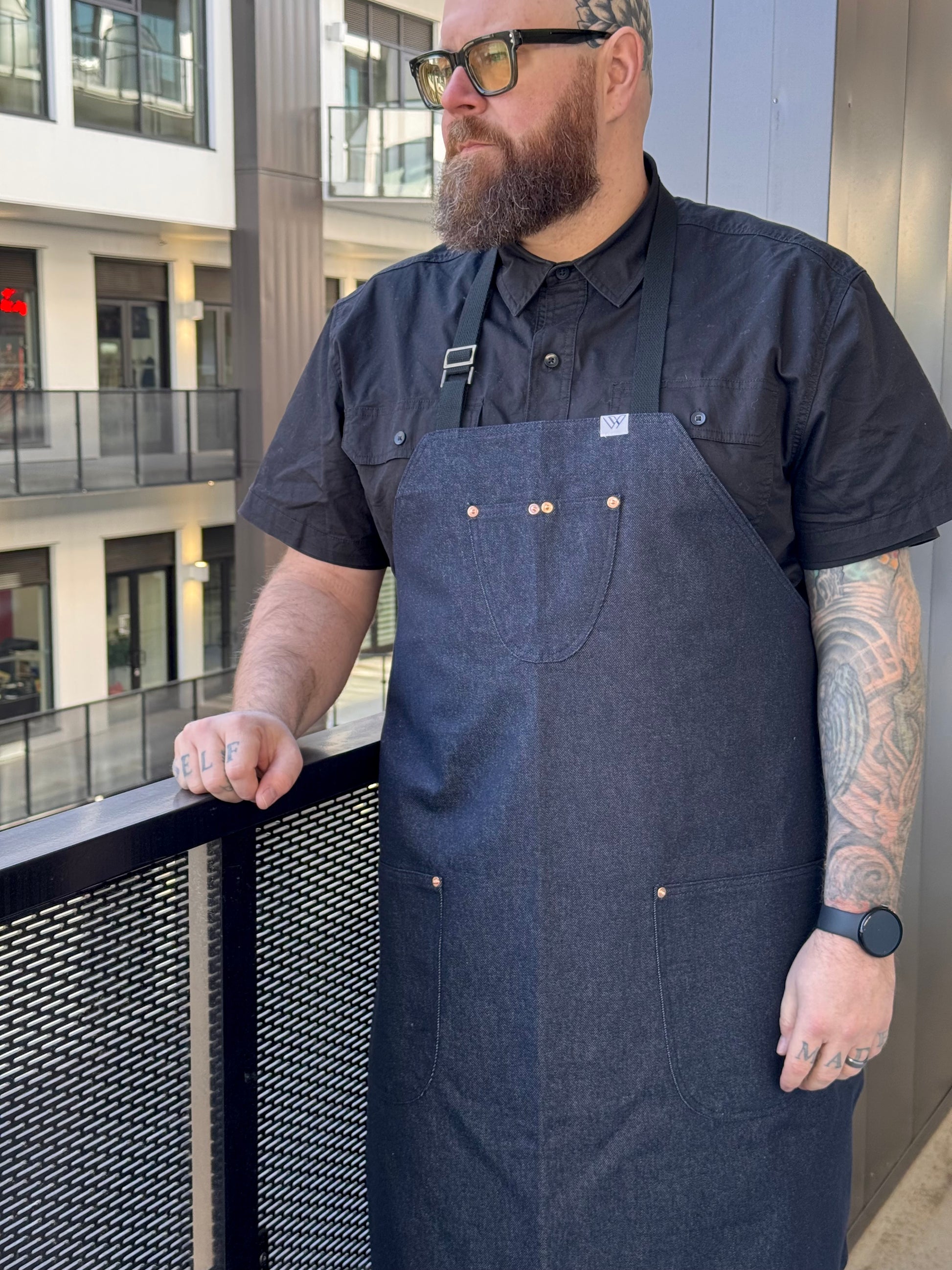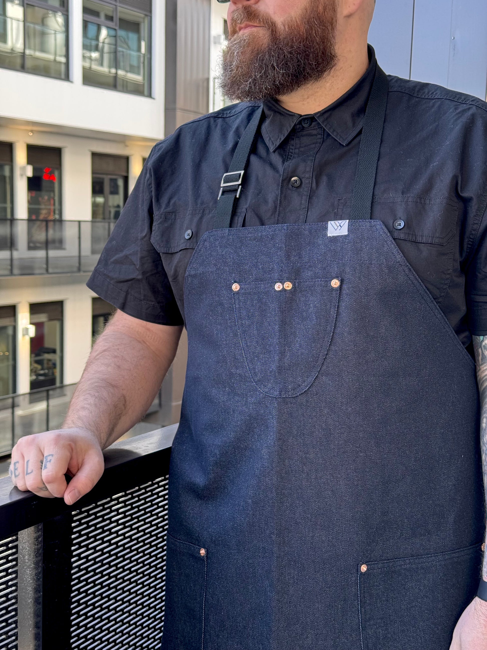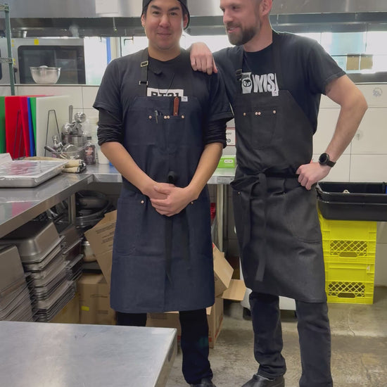 features blue denim, rounded pockets. 2 top slots and 2 side pockets secured with rivets. Adjustable neck straps. Please indicate height when ordering.