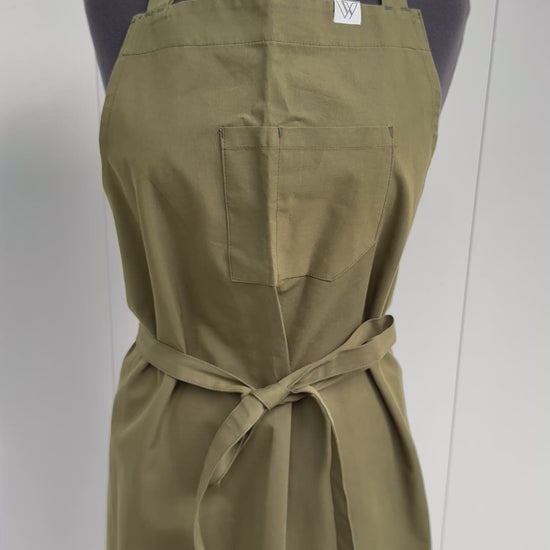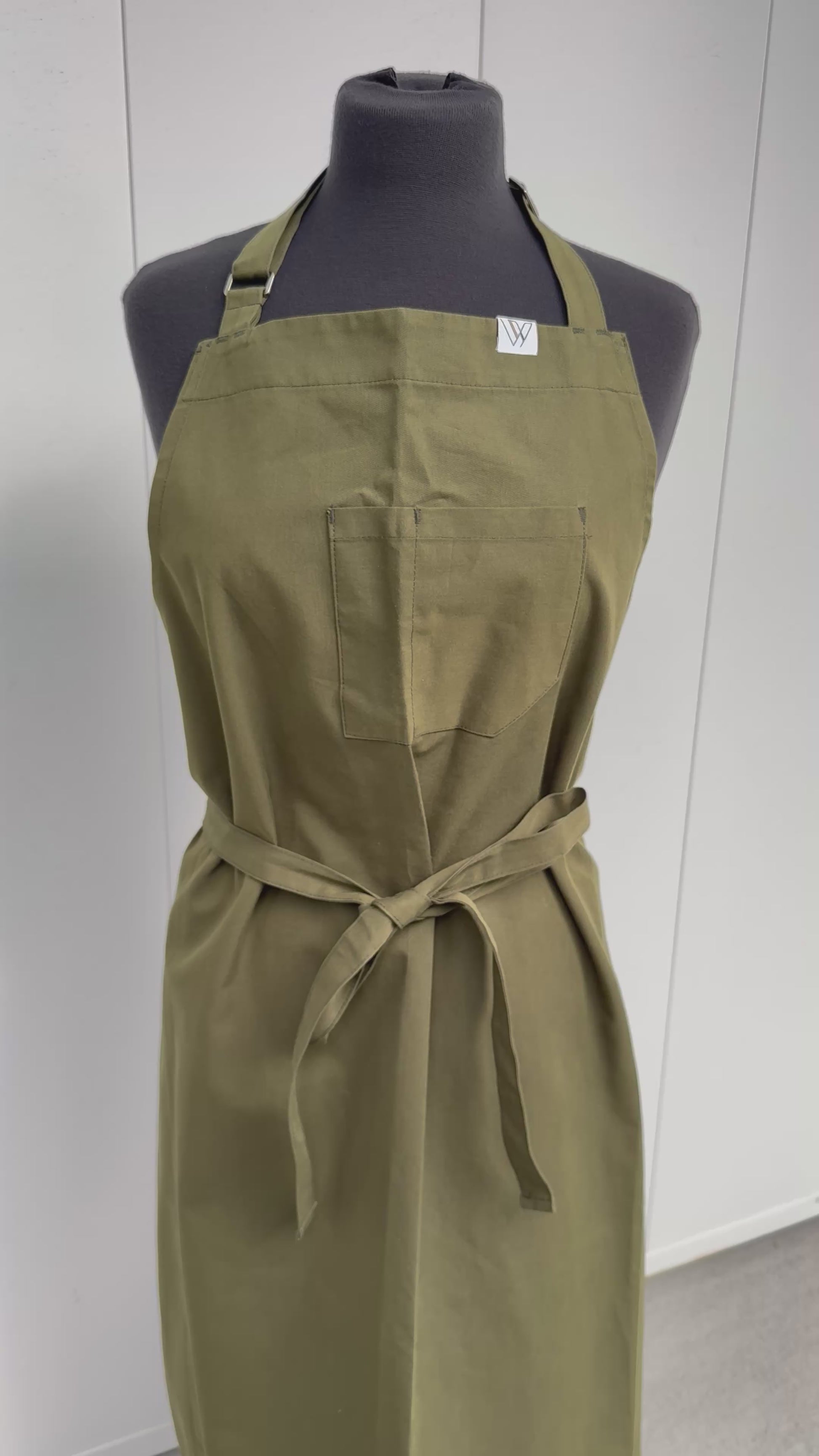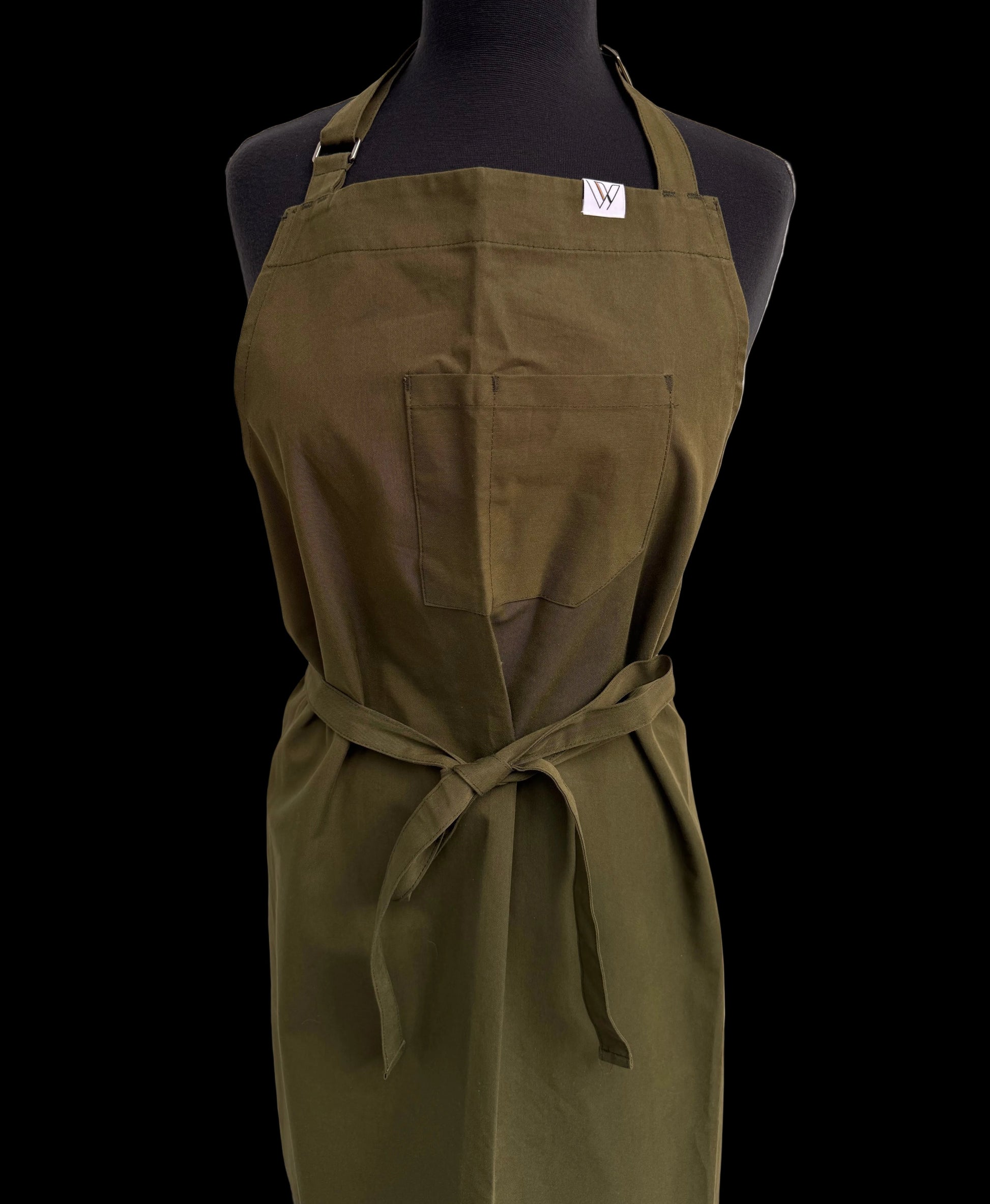 Crafted in olive cotton polyester with 1 wide and 1 slim top pocket. Adjustable neck strap. Sizing 5’4”-5’9”