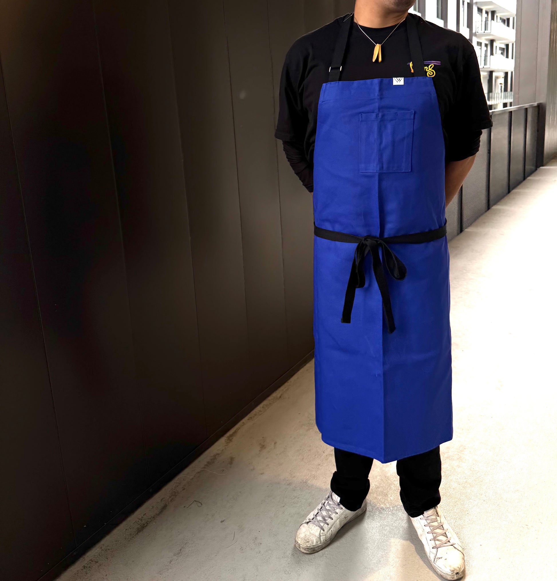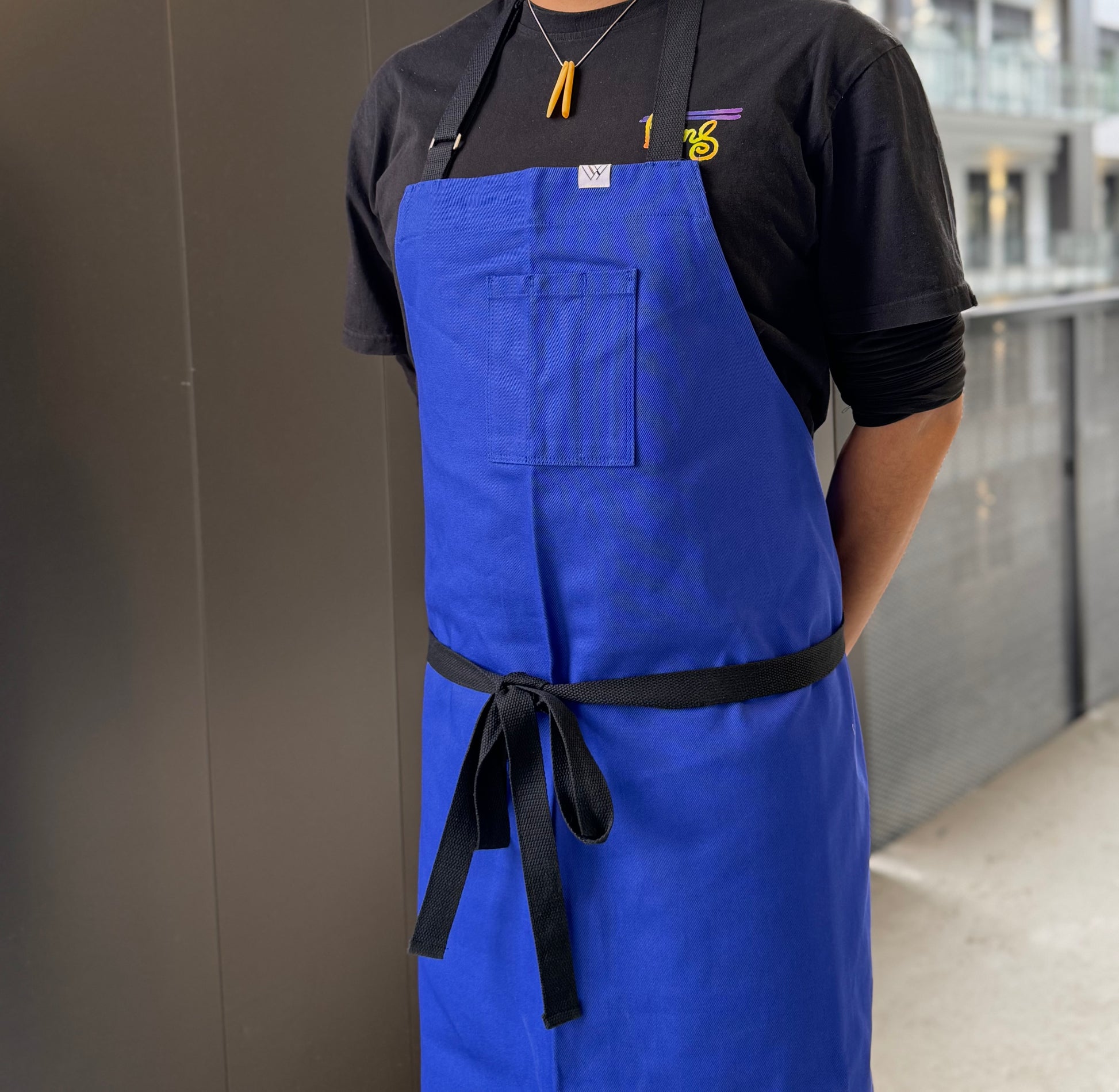 Crafted in cotton twill in royal blue with adjustable black neck straps. Featuring 3 top pockets flushed left. Sizing for 5’9”-6’3”