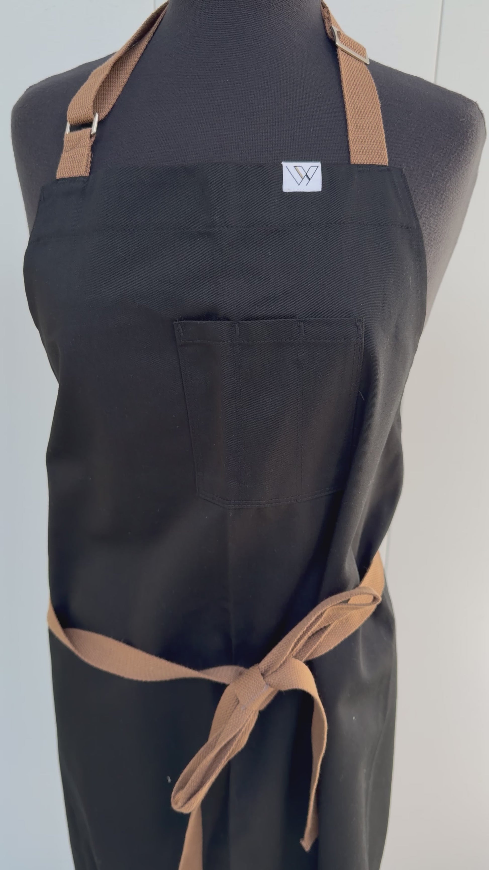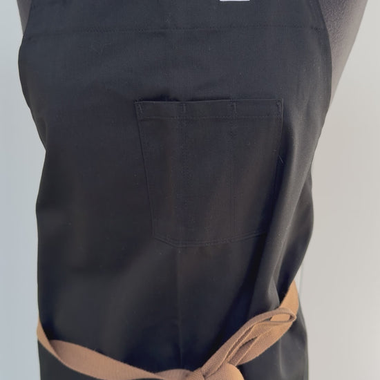 Made from a cotton-polyester blend in black with adjustable brown straps, it features three top pockets and measures 38 inches in length chest to bottom. Sizing 5’4”-5’10”