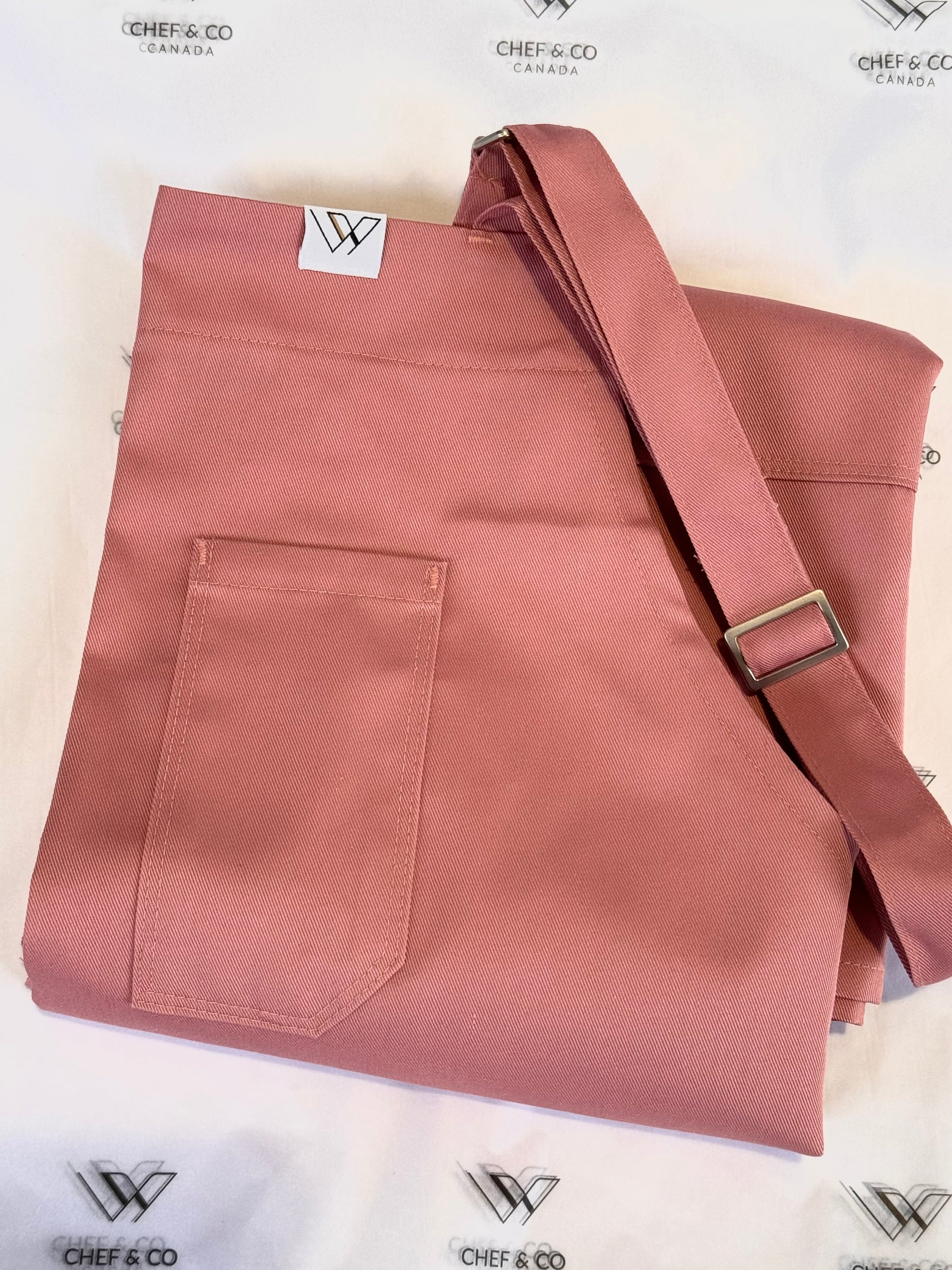 Designed in full pink with minimal top pockets just enough for essentials along with 2 side pockets in cotton polyester. Sizing 5’2”-5’9”