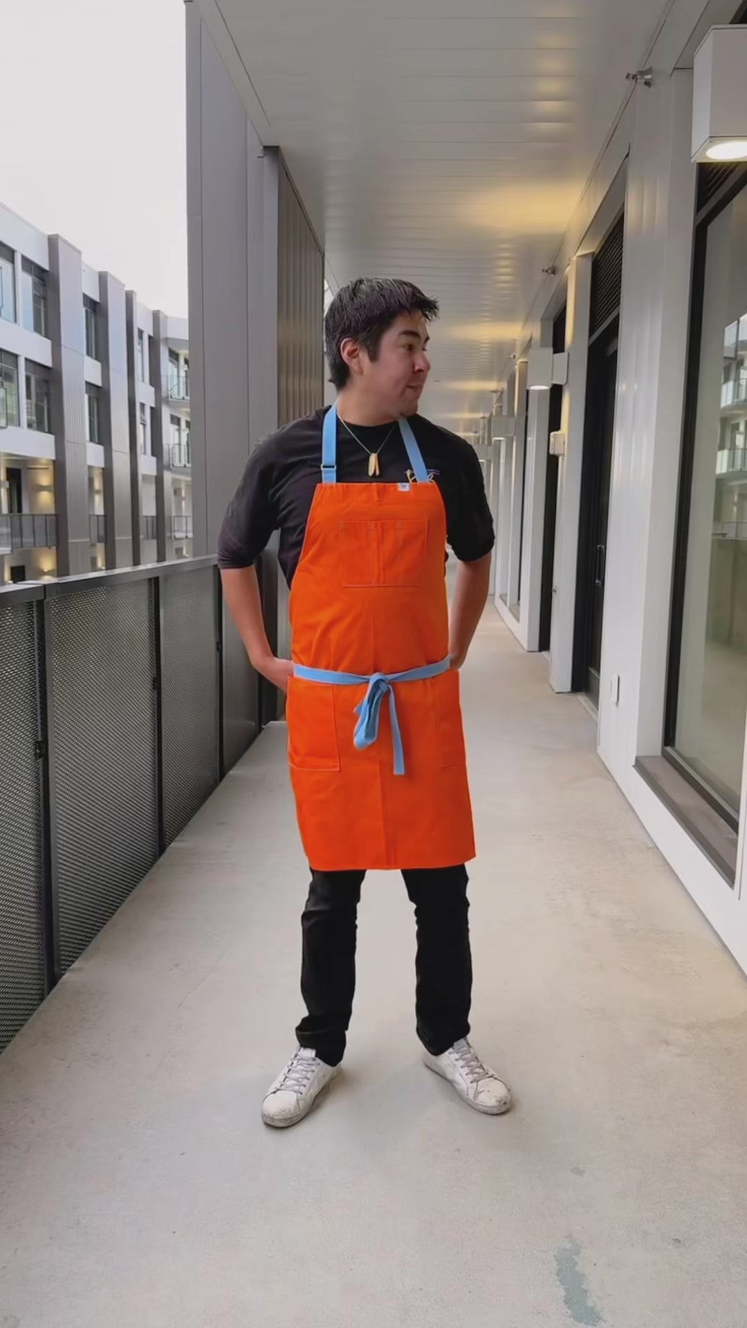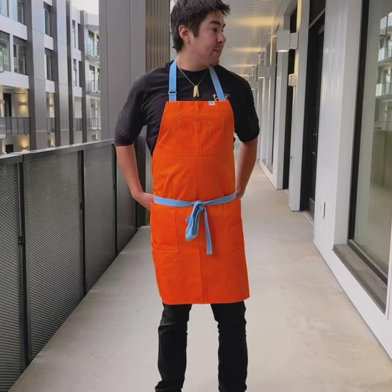 This series features a cotton poly fabric in orange with light blue straps. The detail is in the double stitched pockets matching the straps. There are 3 top pockets and 2 side pockets.